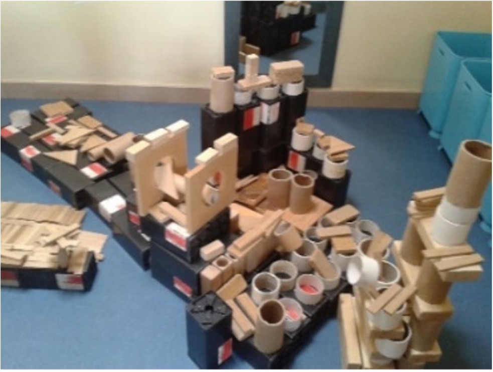 De kleuters bouwen met waardevol kosteloos materiaal een constructie naar keuze.